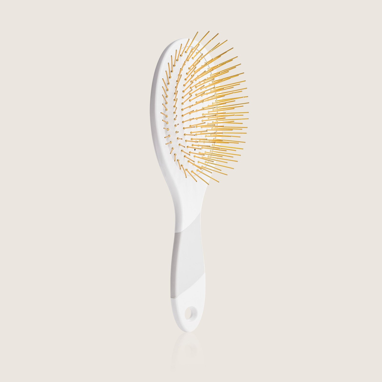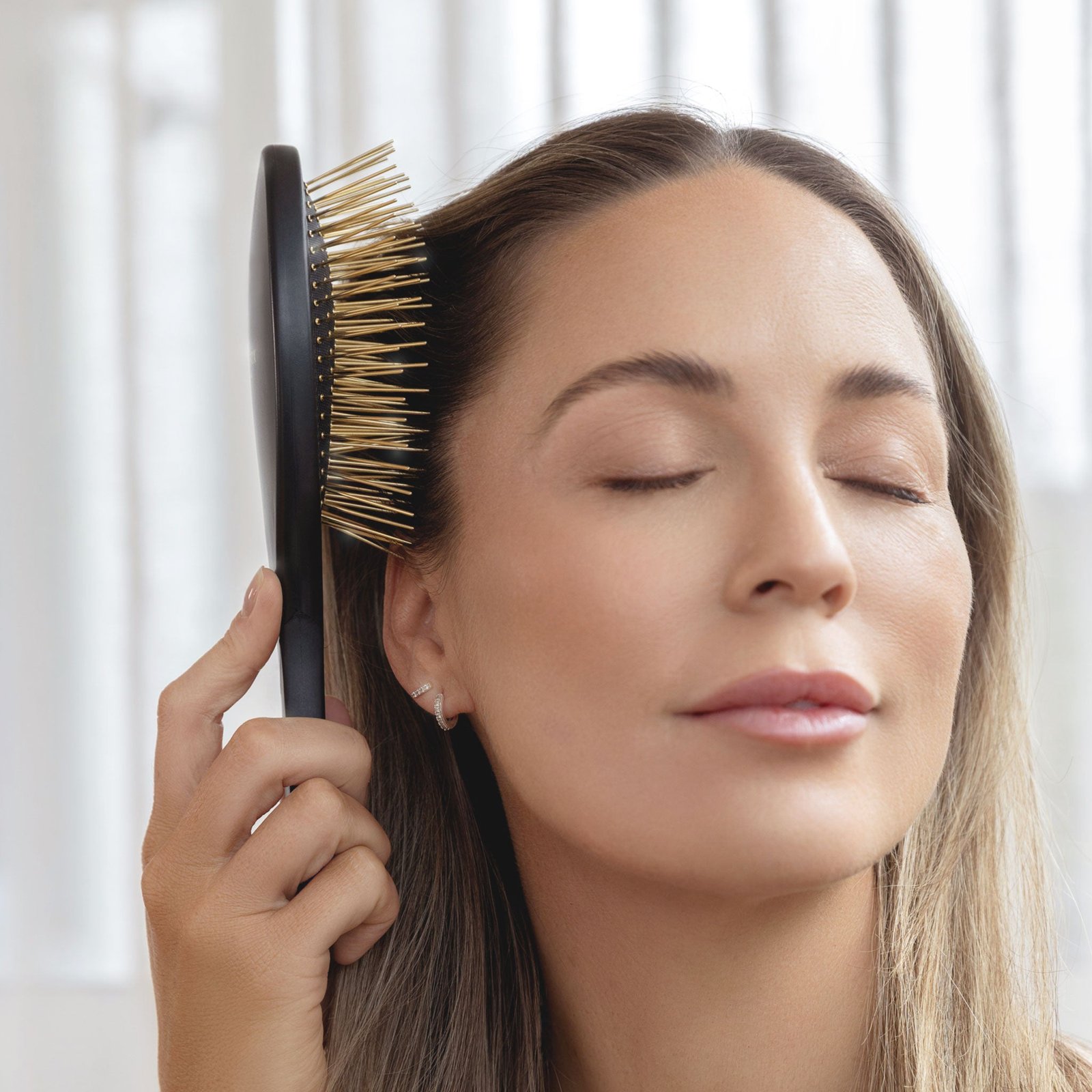 Stimulate acupressure points and promote healthy hair growth with our 24k gold-plated Gua Sha Hair & Scalp Brush.